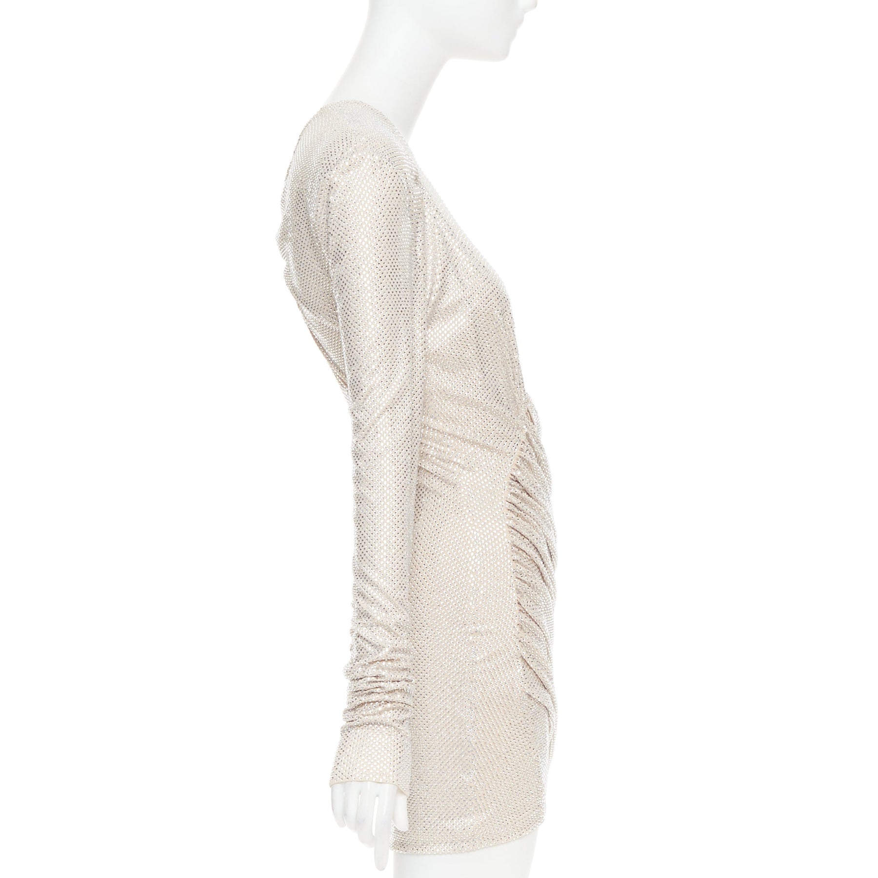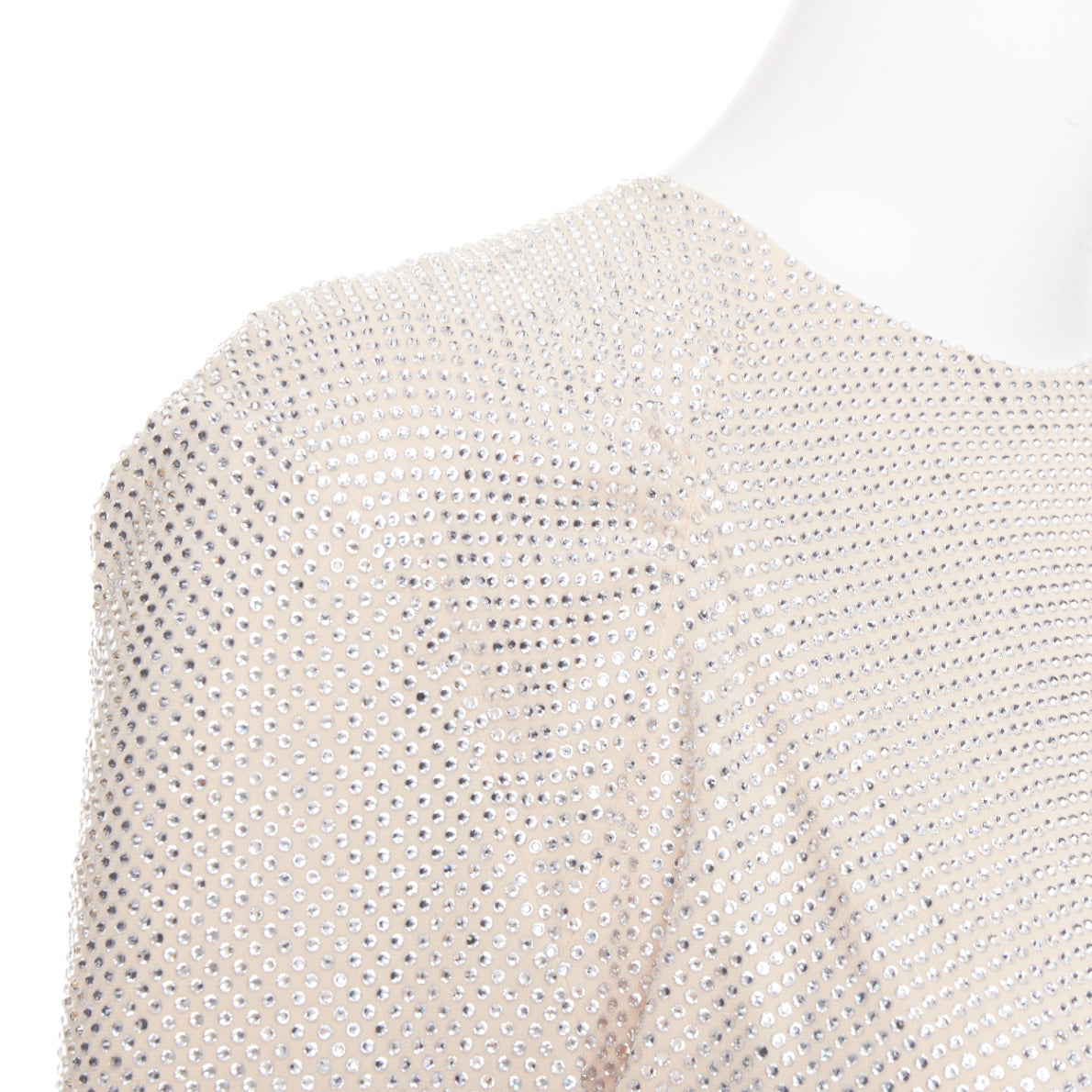 Extra Details: Nude crepe with silver-tone strass crystals. Round collar. Long sleeves. Asymmetric drape bias cut front. Zip back closure. Fully lined. Stretch fit.