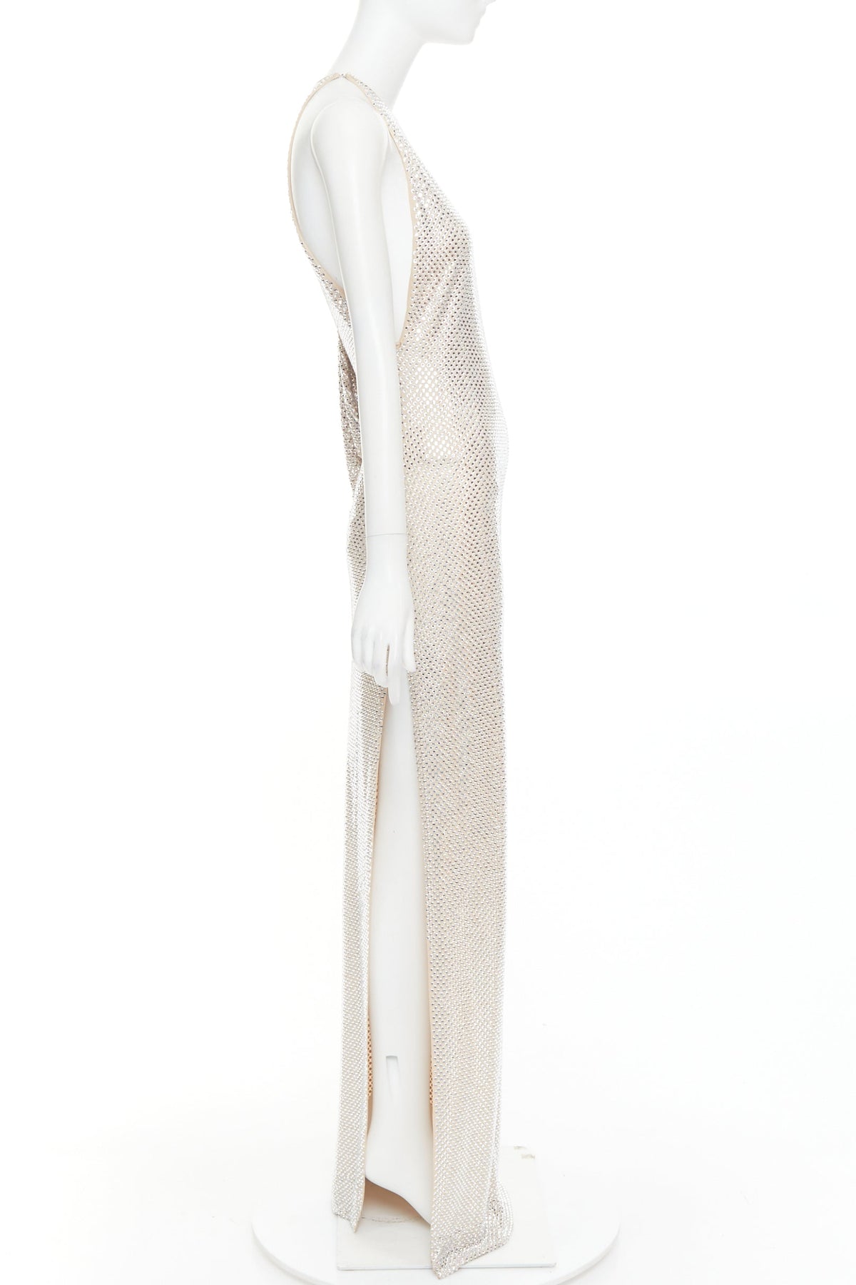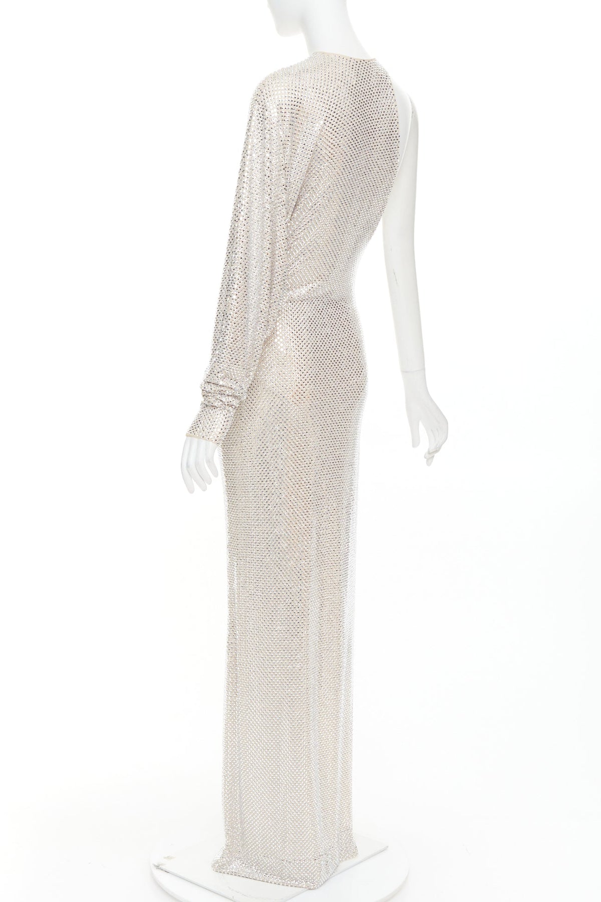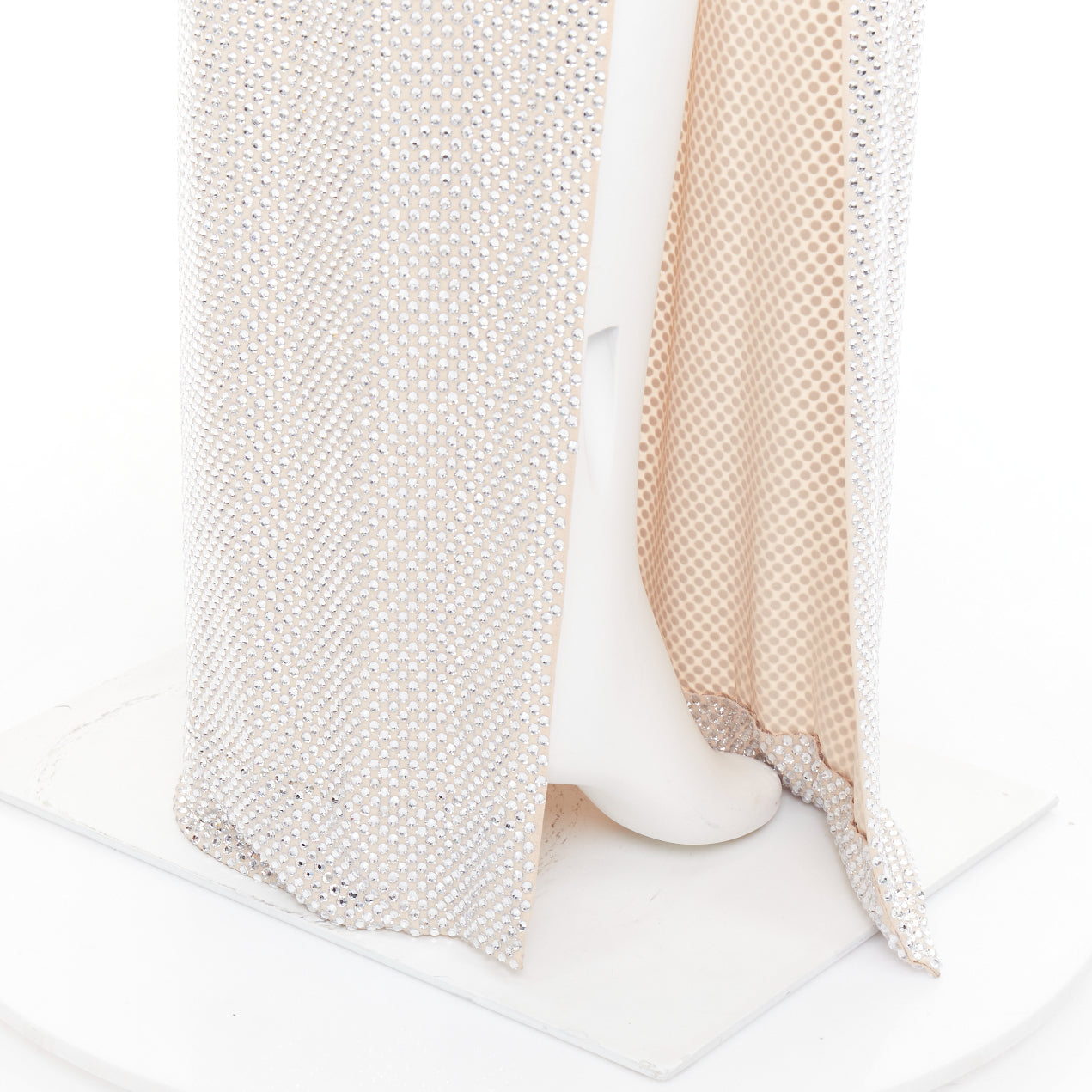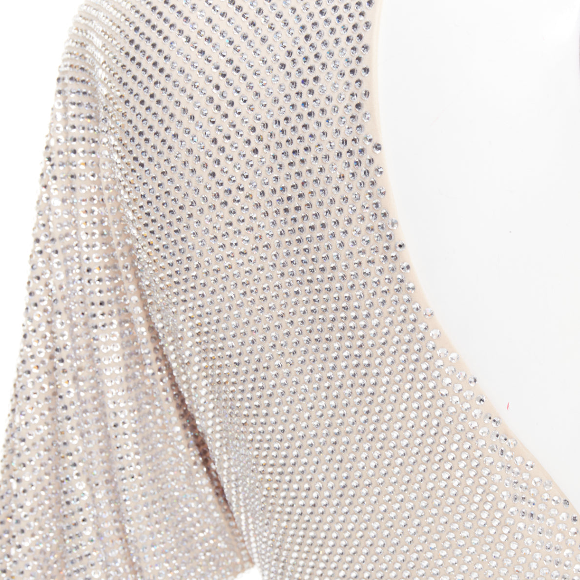 Extra Details: Nude crepe with silver-tone large strass crystals embellishments throughout. Round collar. Asymmetric sleeves. Batwing long sleeves. Hook and eye closure on neckline. High side slit. Zip side closure. Fully lined. Stretch fit.
