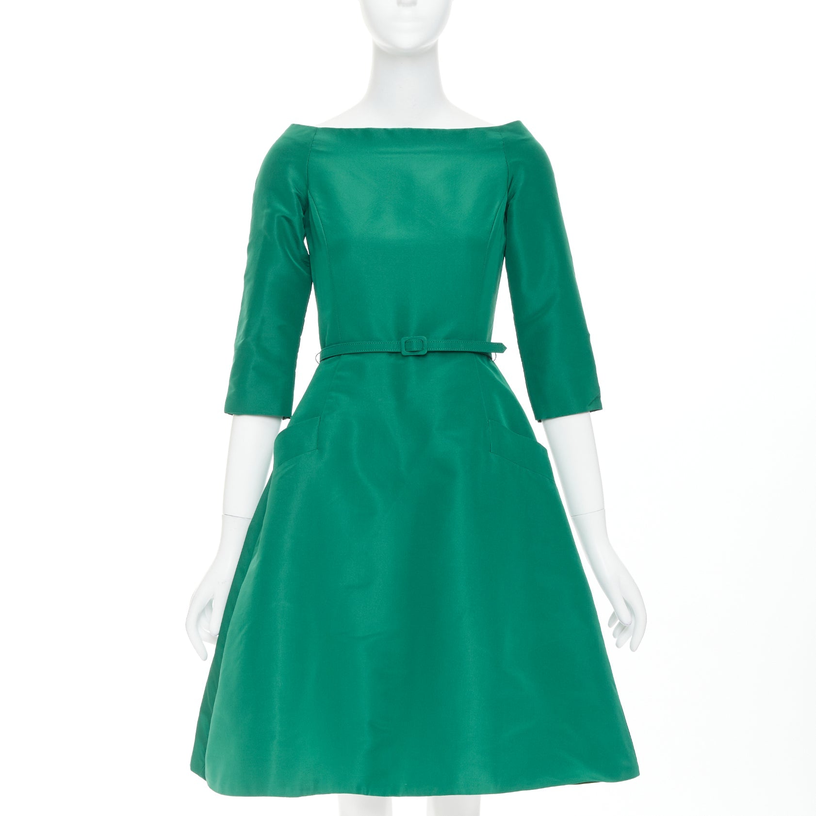 OSCAR DE LA RENTA F17 kelly green silk taffeta bateau neck belted fit flare dress US0 XS