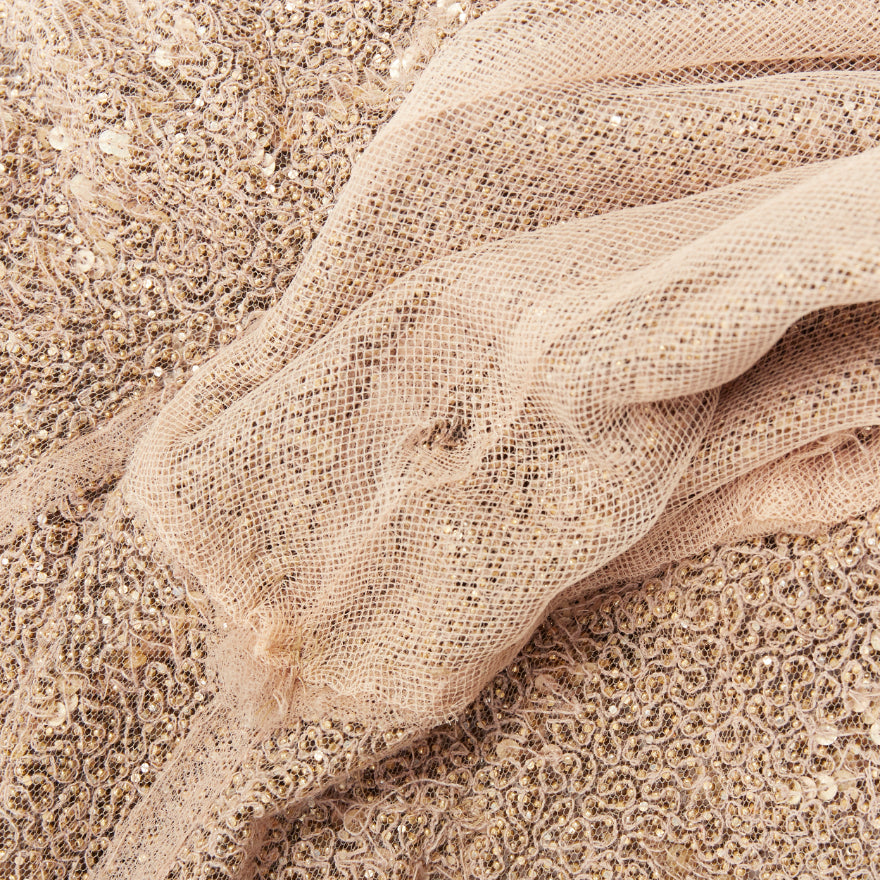 Extra Details: Fully embroidered in gold-tone micro beads with speckle sequinned detail. Fine shoulder strap. Plunge neckline. Fipped open back. Mermaid train gown. Fully lined.