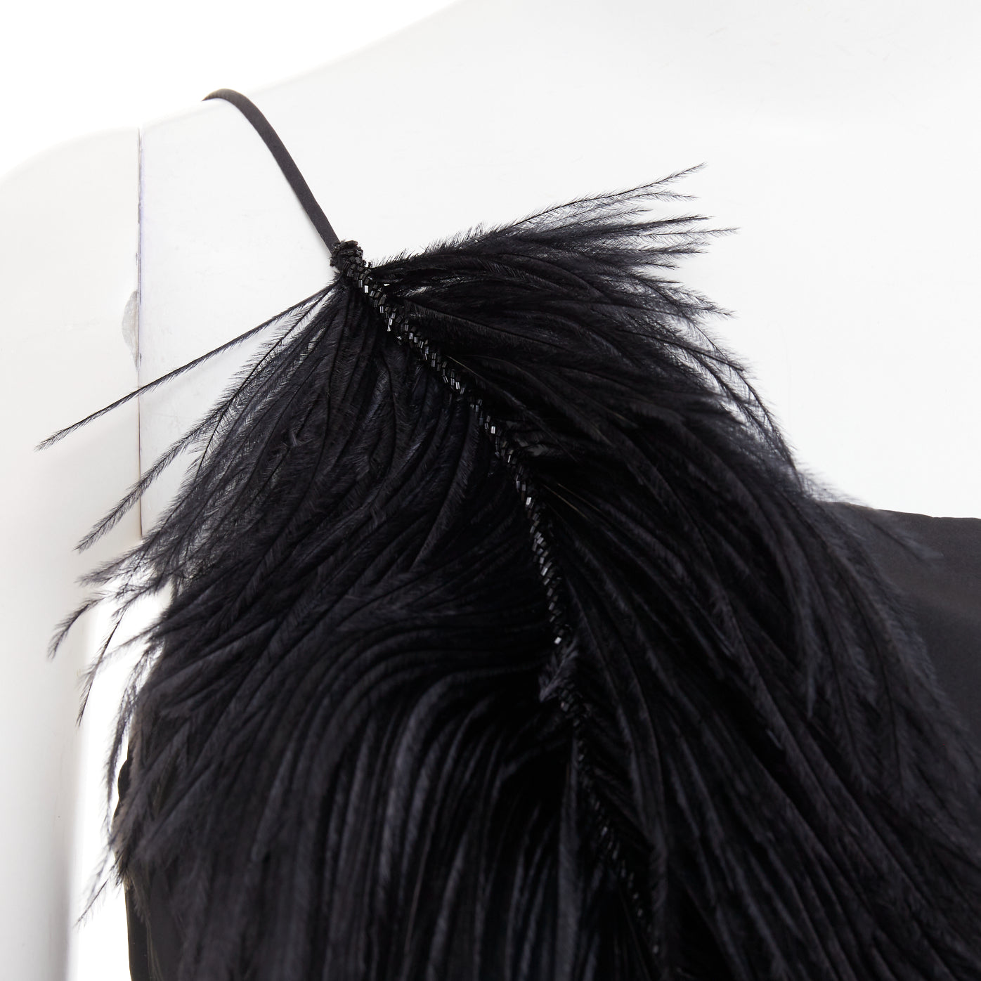Extra Details: Seen on the runway in Paris, this beautiful taffeta gown is gathered through the asymmetric skirt to create structural volume. The one-shoulder neckline is embellished with gold beads and wispy feathers.