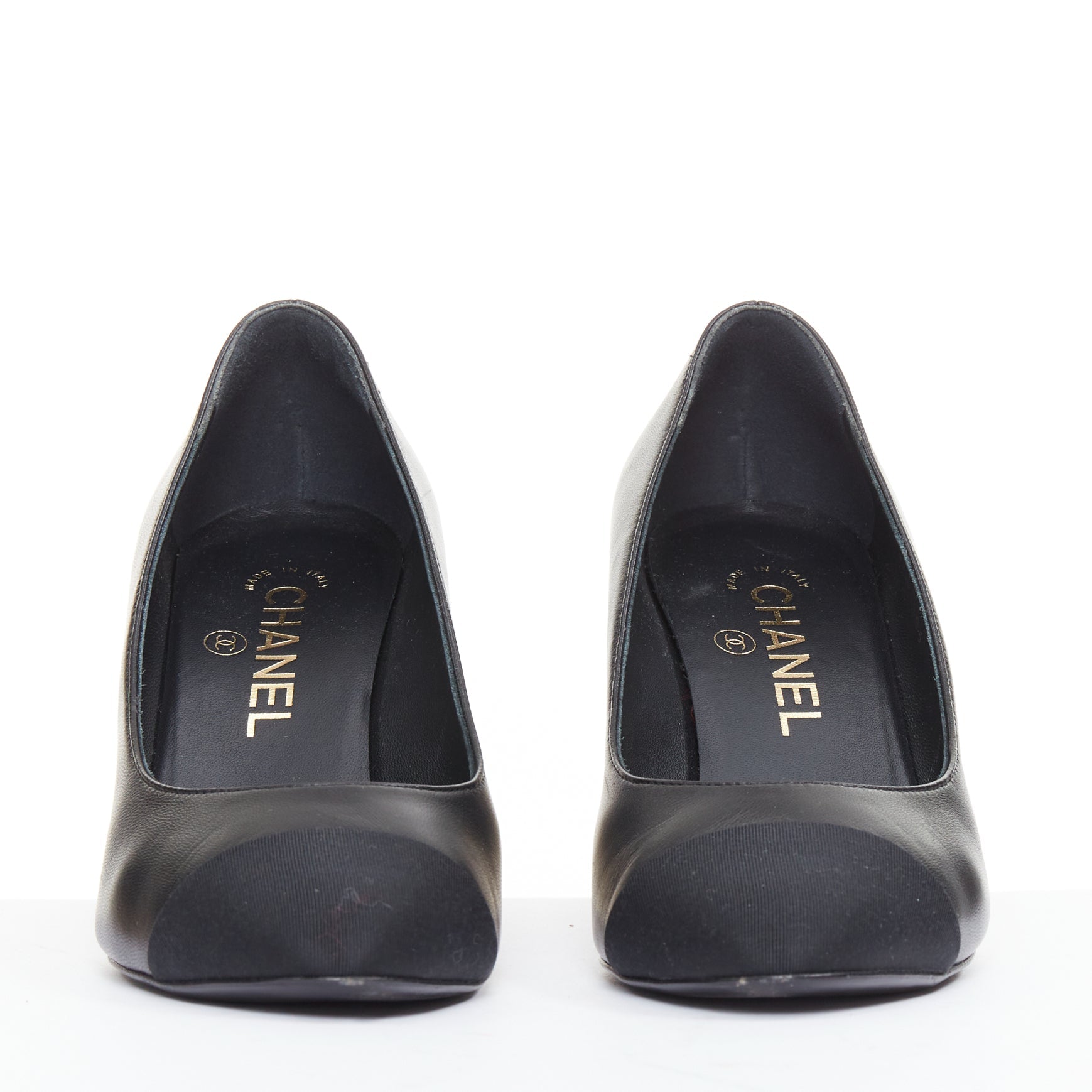 CHANEL 2018 Egypt Hieroglyphic black leather grosgrain toe cap pumps EU36.5