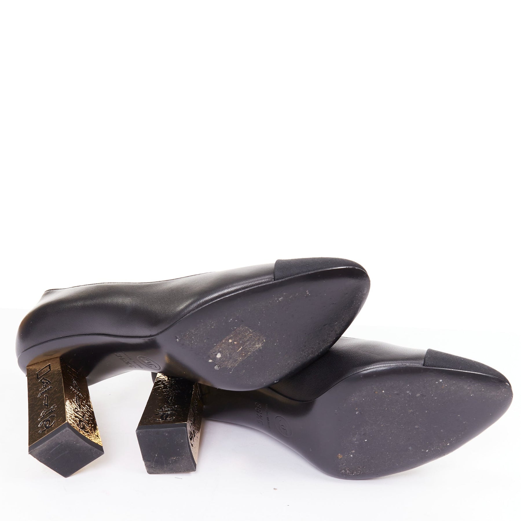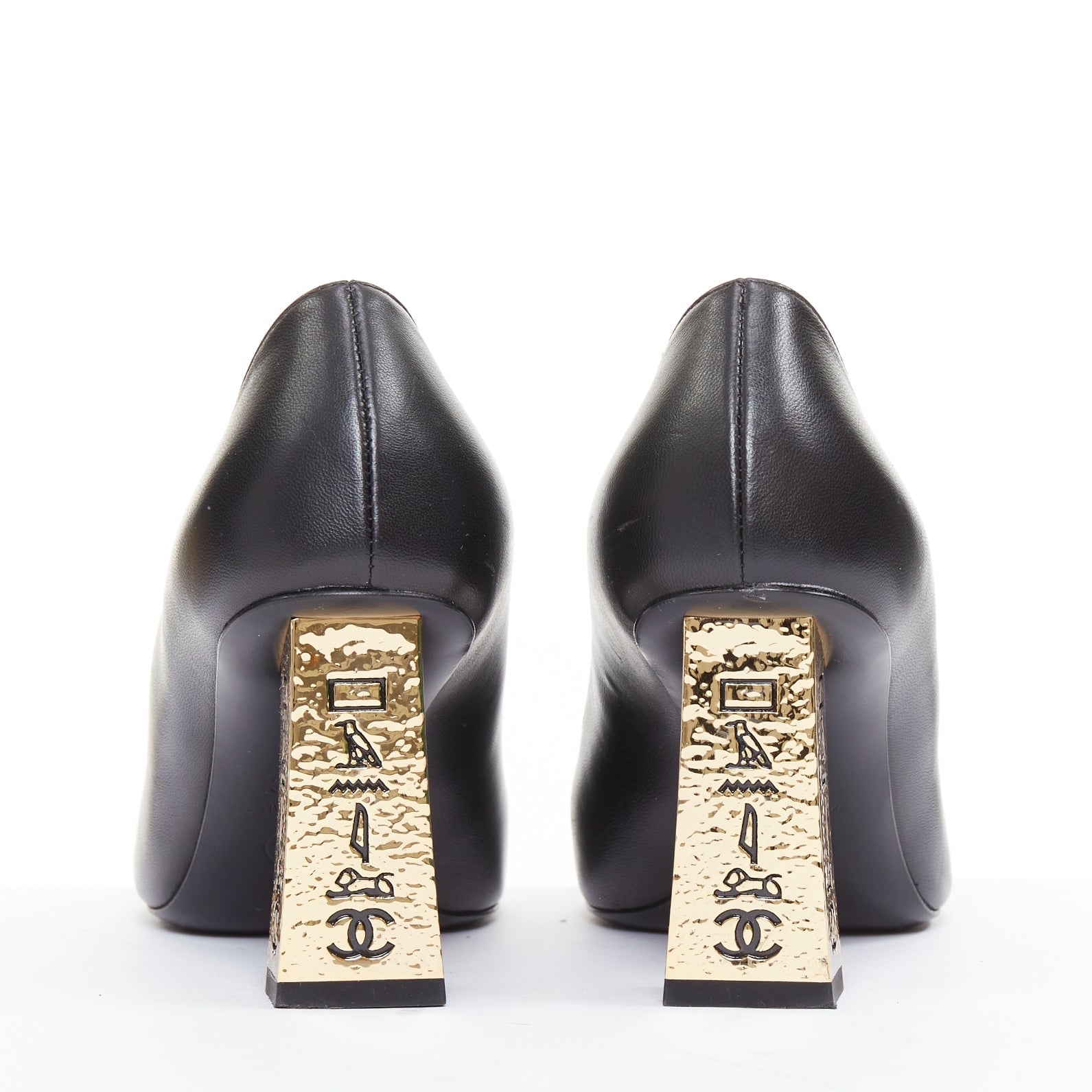 Extra Details: The shoes are black leather pumps with a classic black grosgrain cap toe. The distinctive feature is the gold-tone block heel, intricately engraved with patterns resembling ancient Egyptian hieroglyphics and a CC logo.