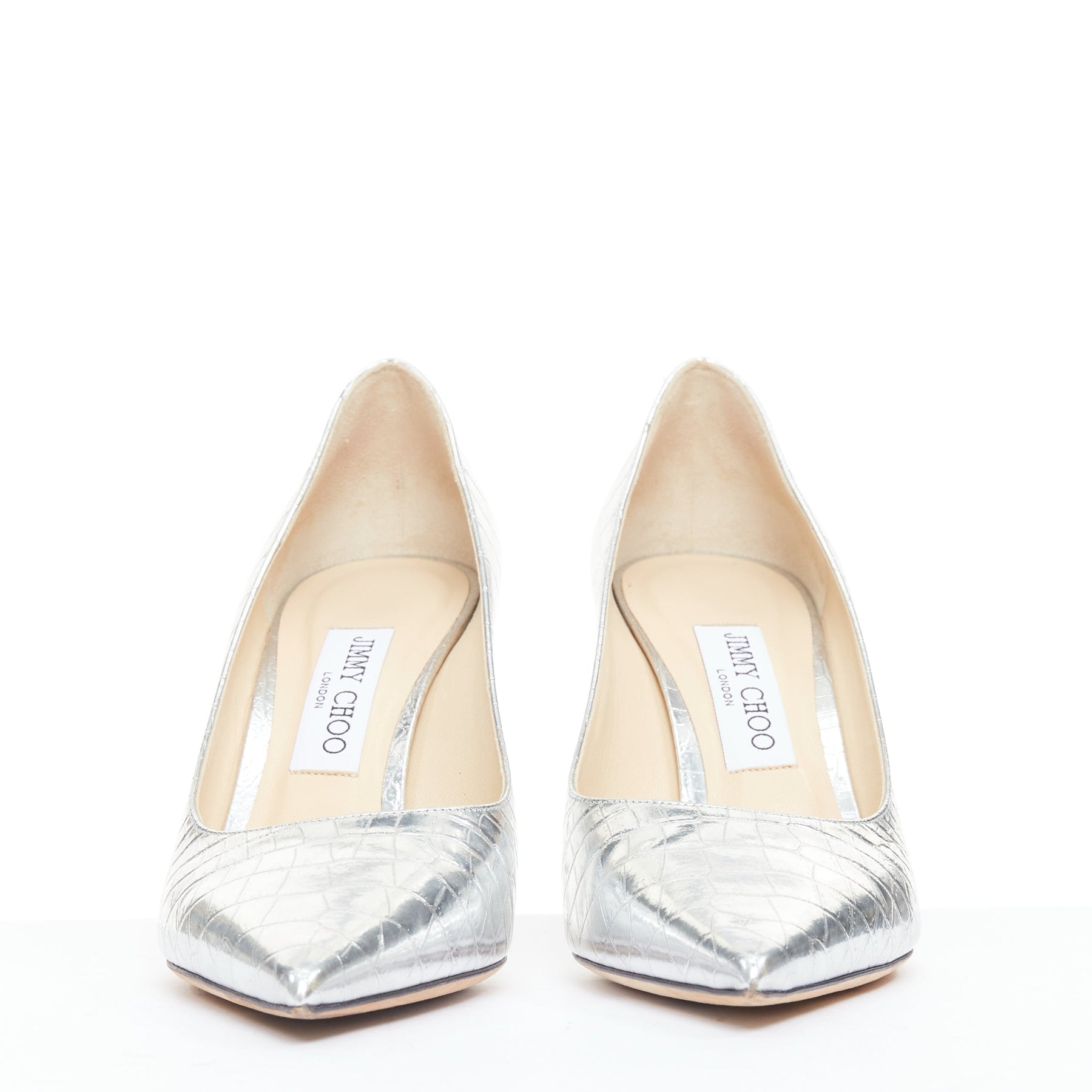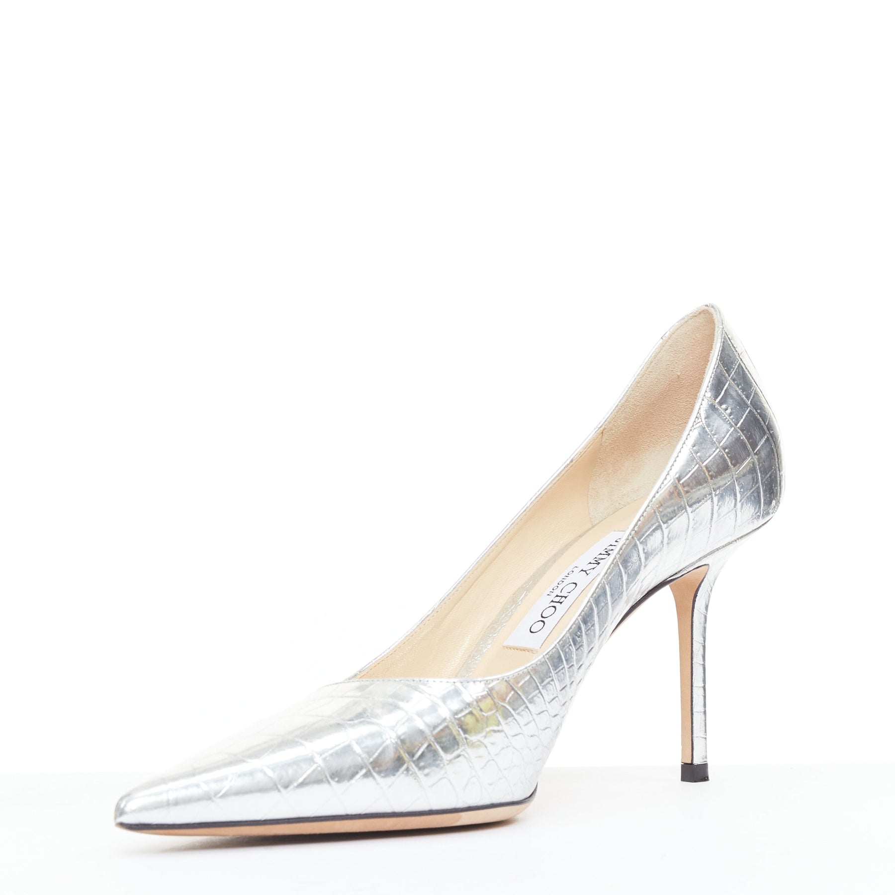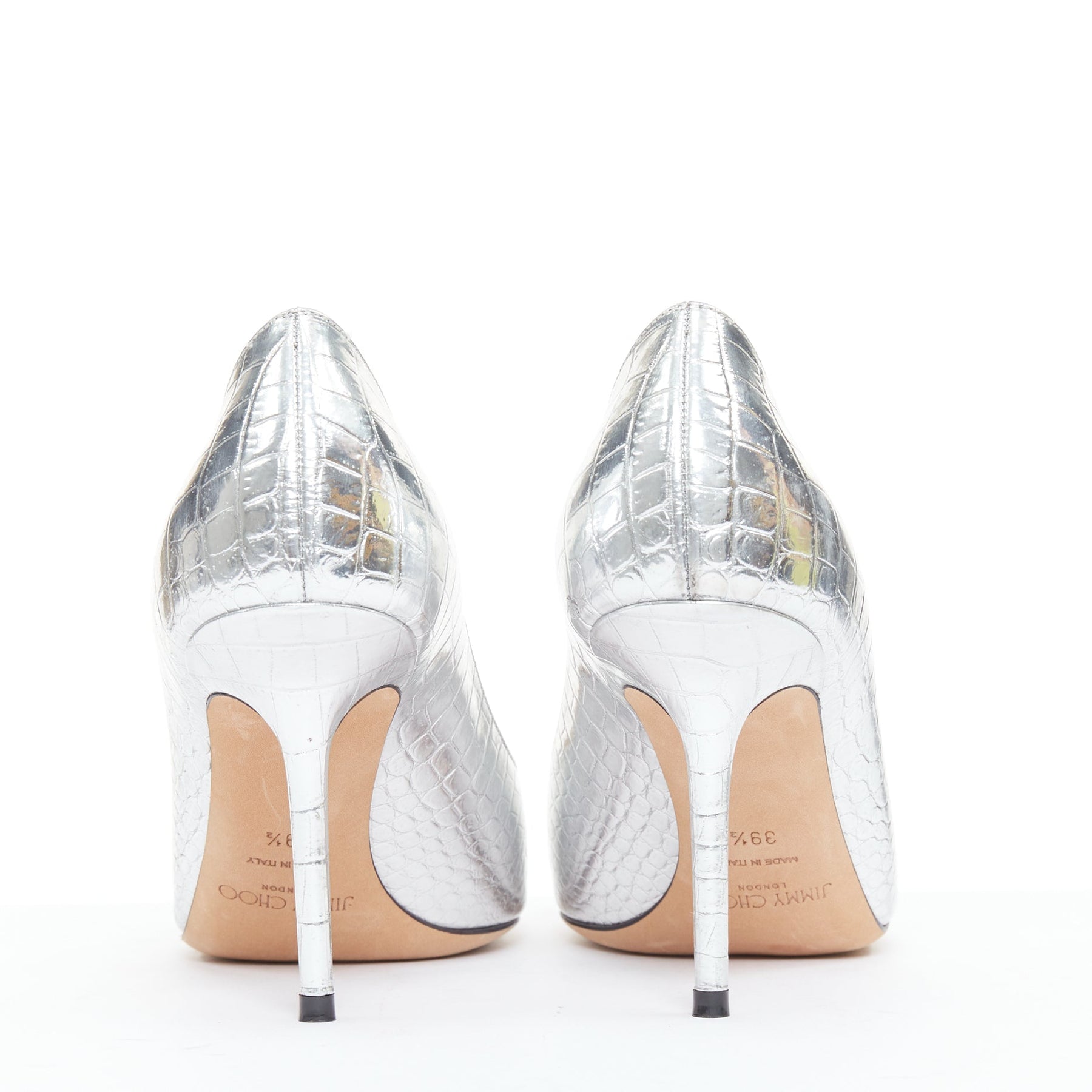JIMMY CHOO Love mirrored silver croc embossed leather pointy pumps EU39.5
