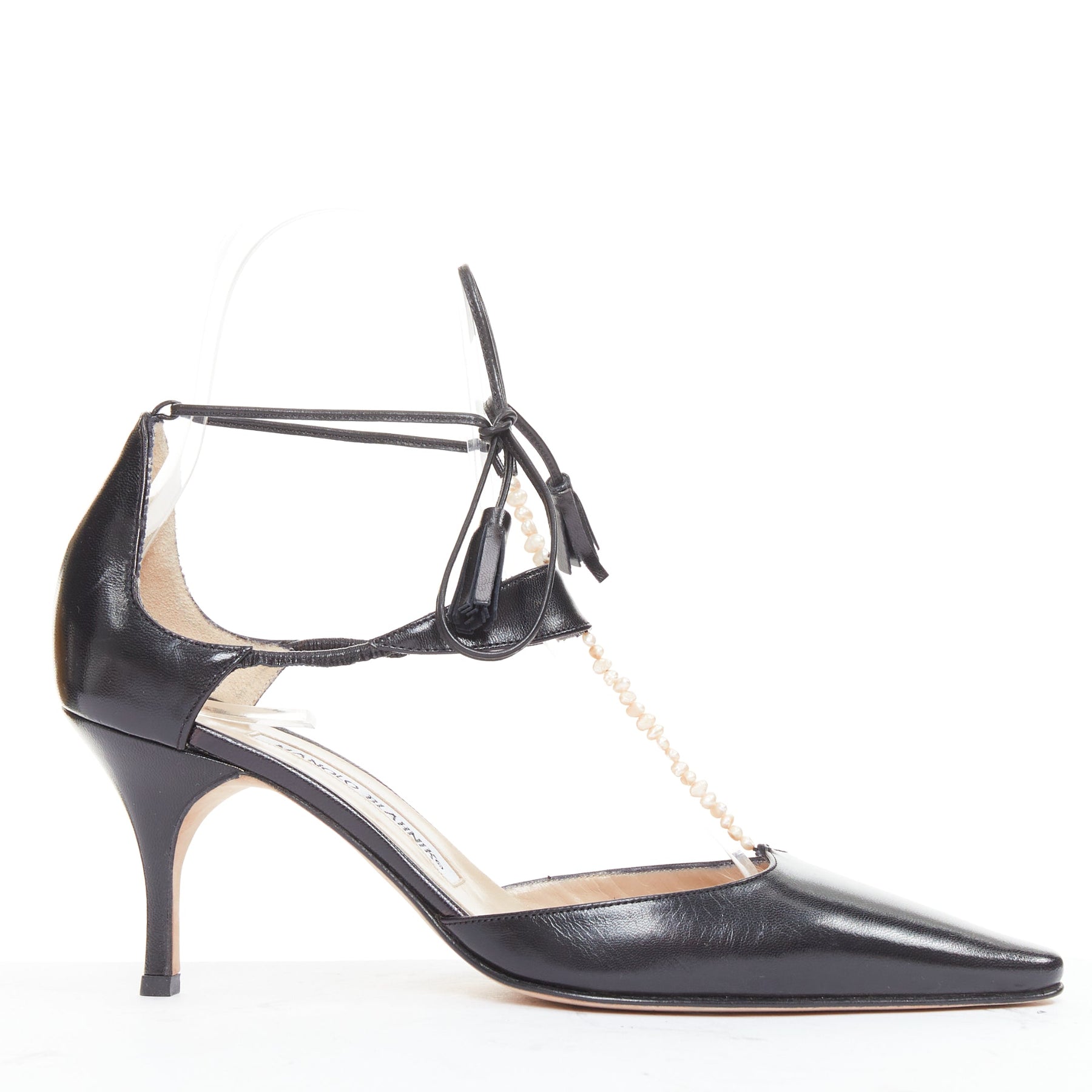 MANOLO BLAHNIK black calf leather nude pearl embellished tstrap heels EU36.5