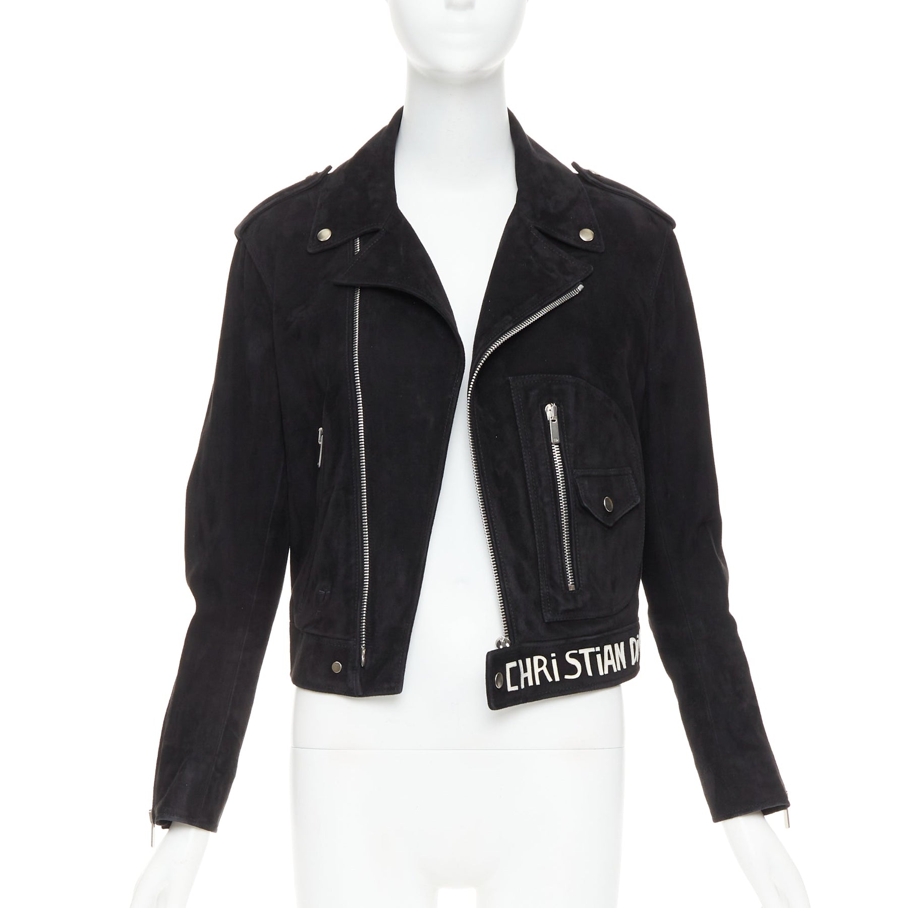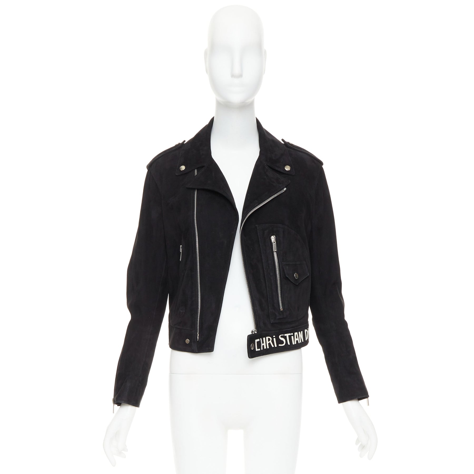 CHRISTIAN DIOR black suede lambskin leather patchwork applique biker jacket FR36 S