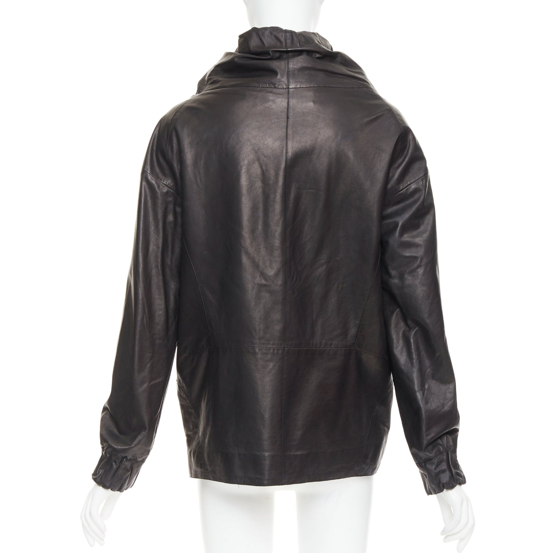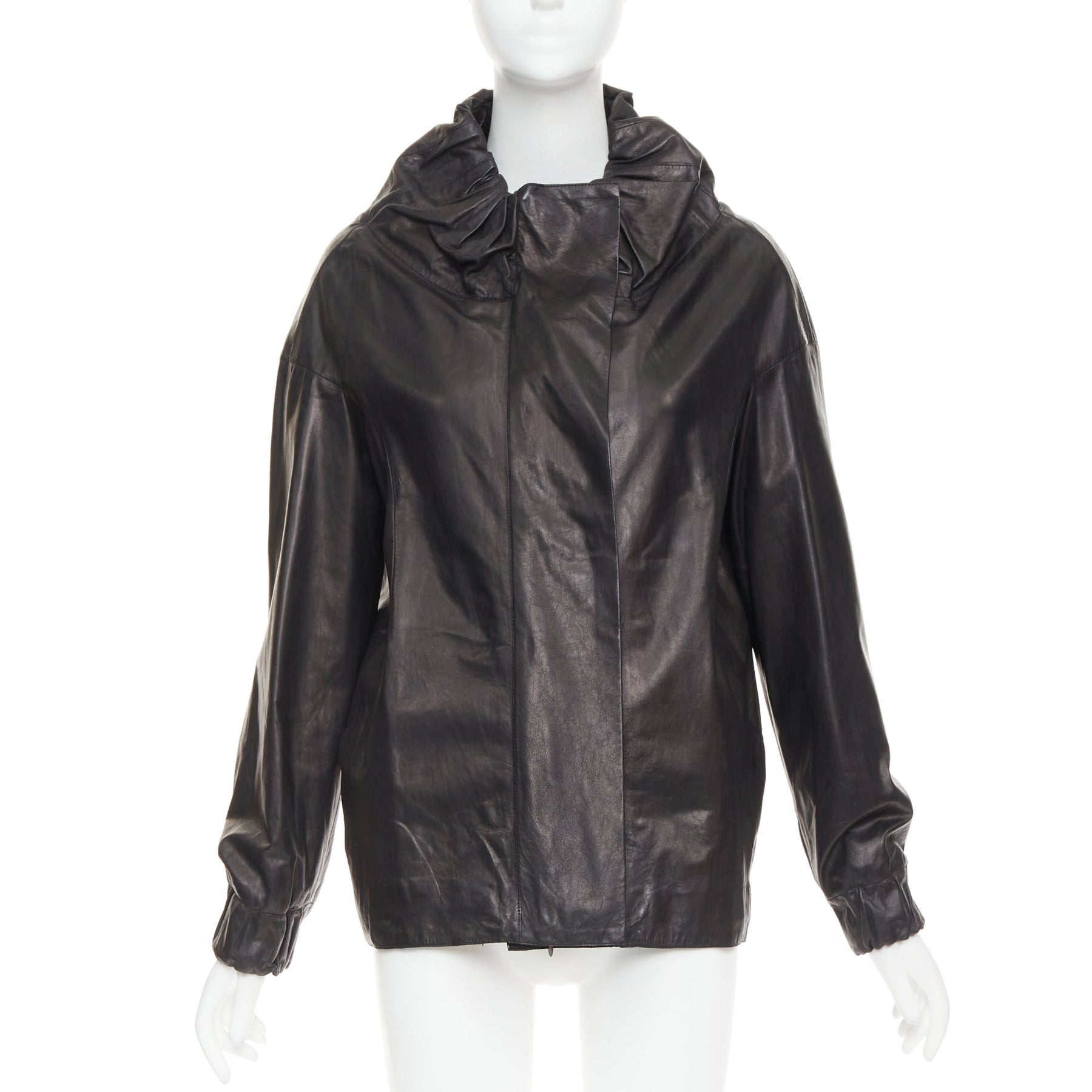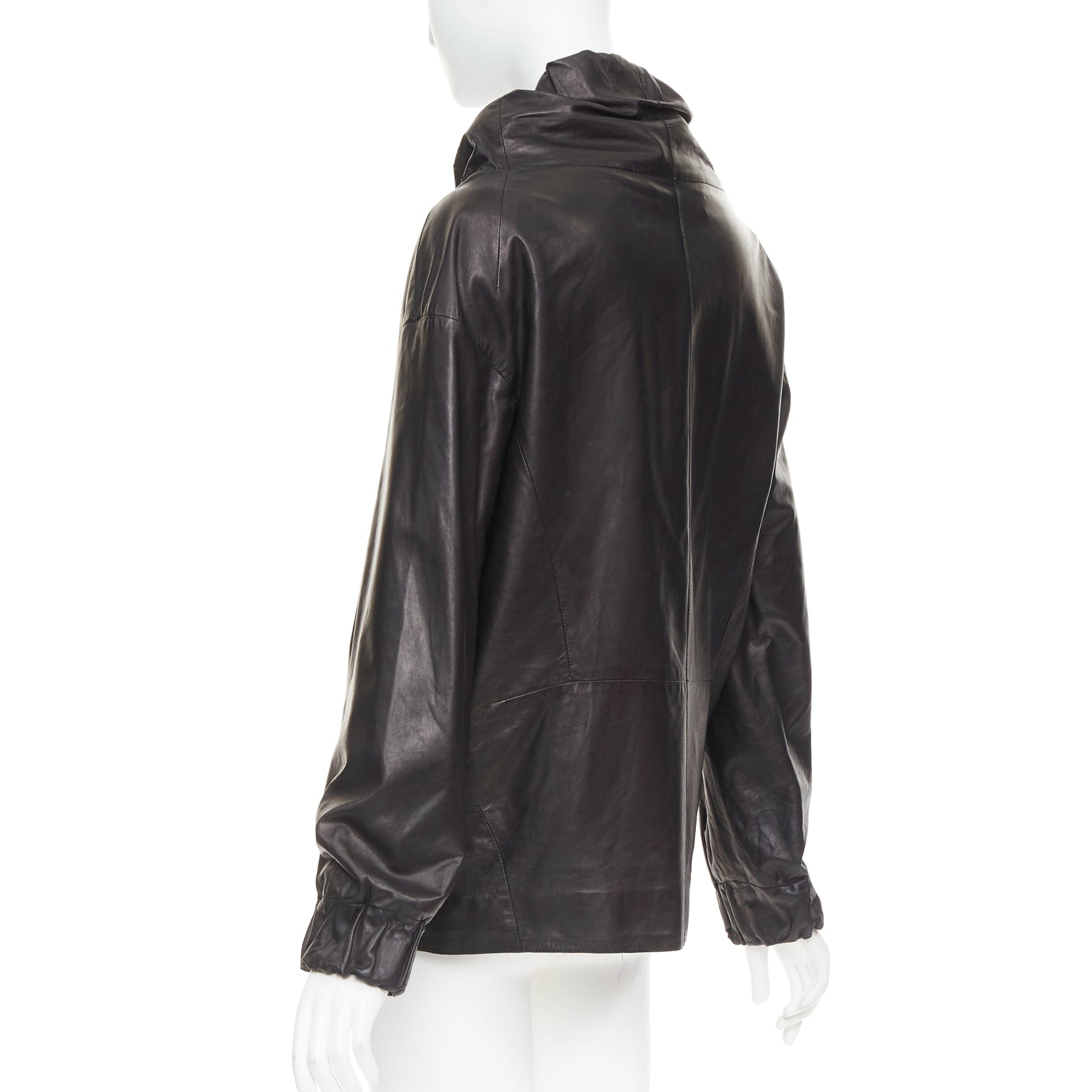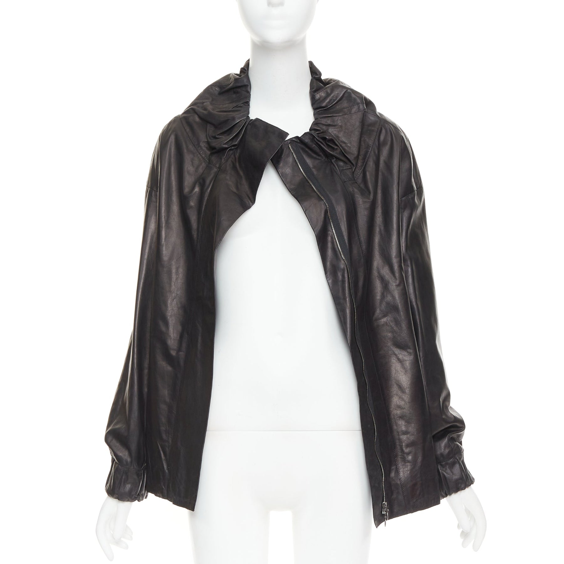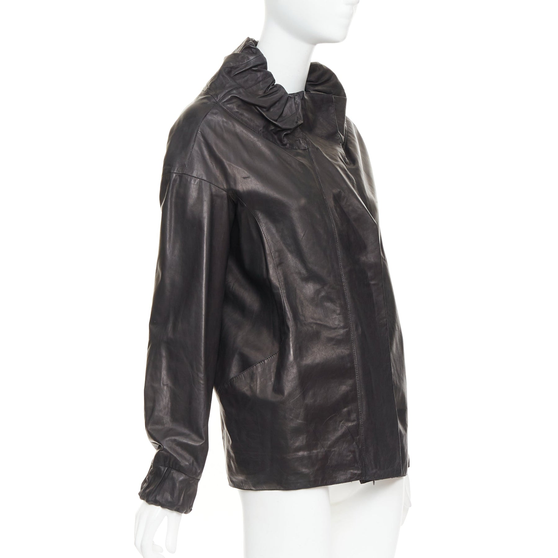 MARNI black lamb leather gathered collar zip up oversized jacket IT42 M