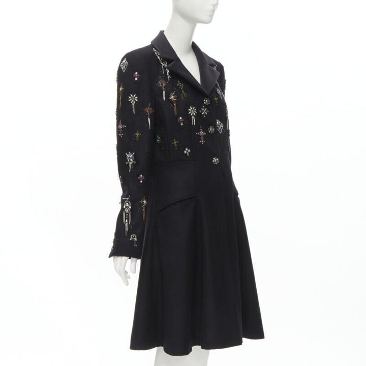 Extra Details: Black wool cashmere blend. Satin lined notched collar. 2 slit pocket. Shoulder padded. Punk embellishment in starburst and Byzantine Cross. Crystal and chain trimming with safety pin details. CC pearl and silver crystal jewel button. 5-button cuff. Black silk lining.
