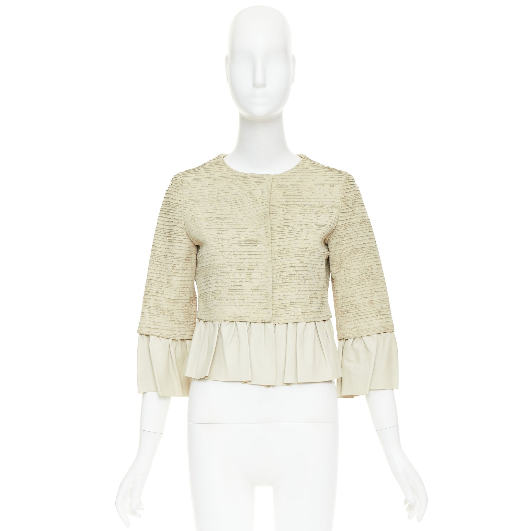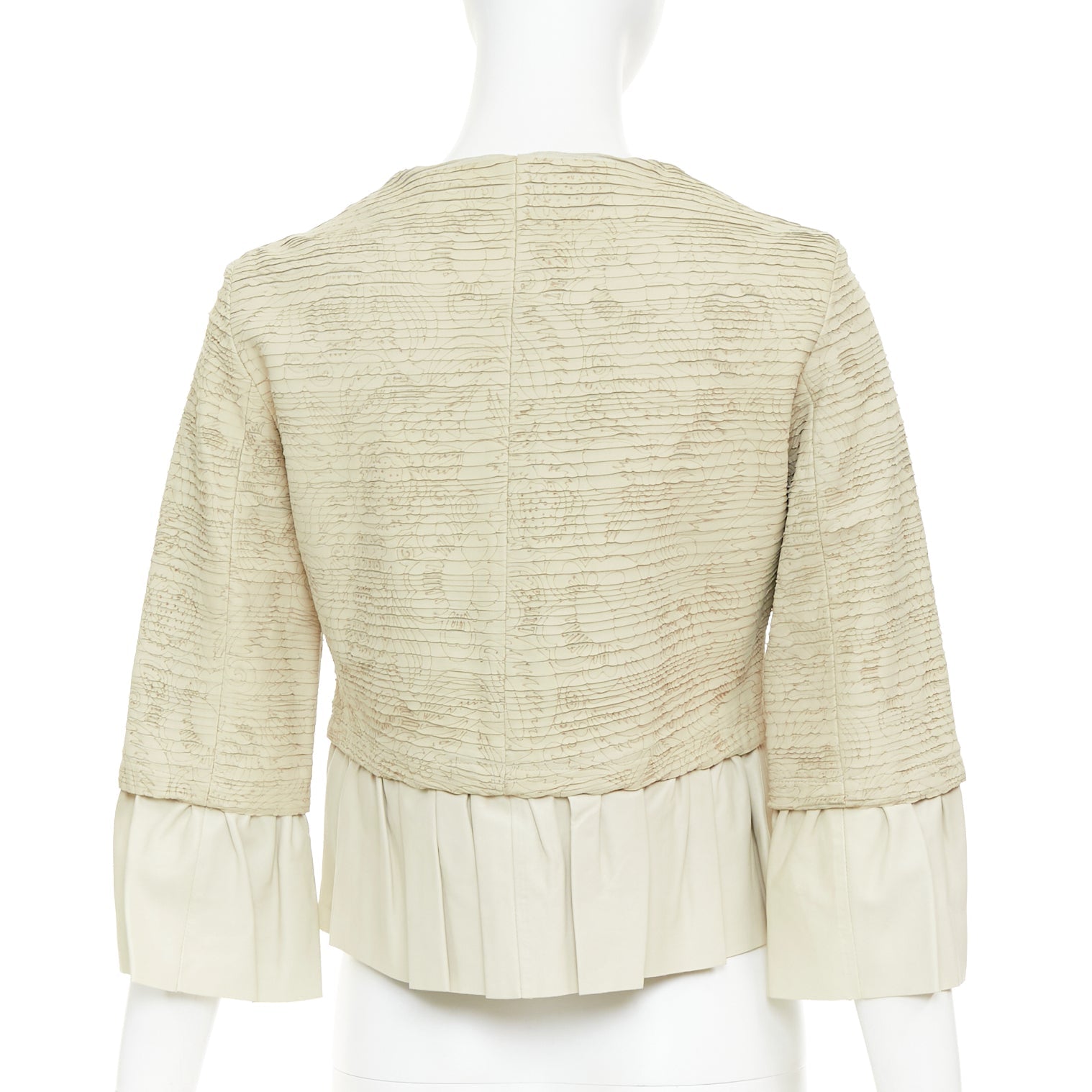 VALENTINO beige lambskin leather floral tiered laser cut ruffle cropped jacket IT40 S