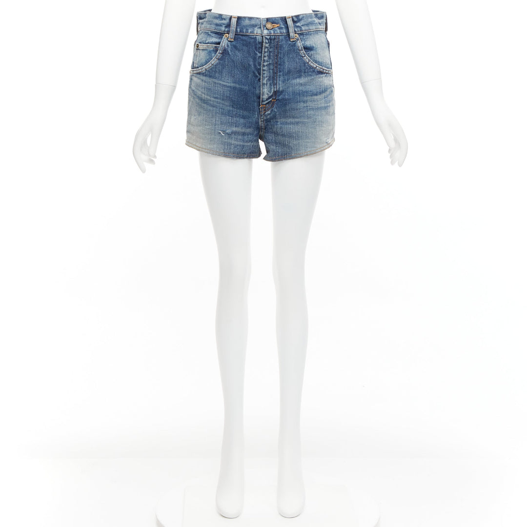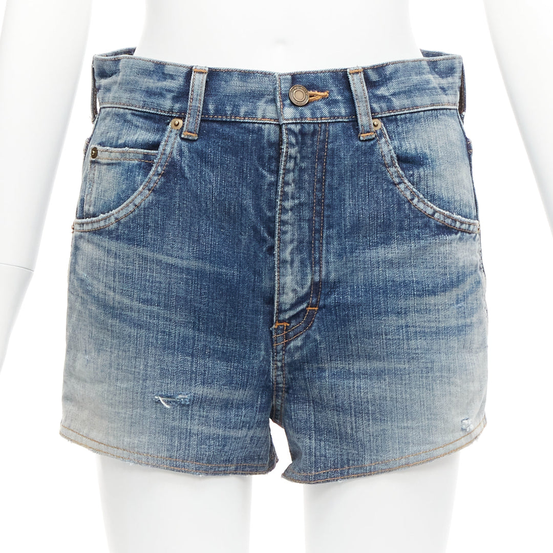 SAINT LAURENT 2020 blue distressed washed denim high waisted shorts 29"