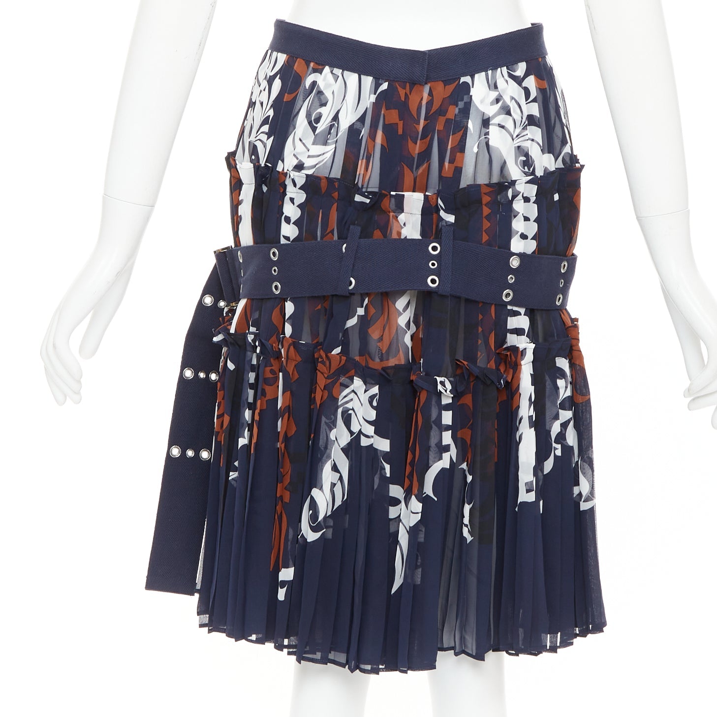 SACAI 2016 navy orange white printed pleated cotton eyelet belt skirt JP1 S