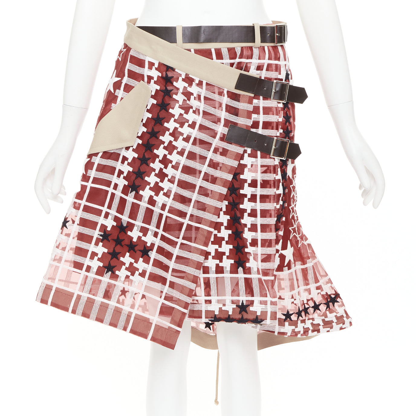 SACAI 2017 red white houndstooth star check sheer leather buckle wrap skirt JP2 M