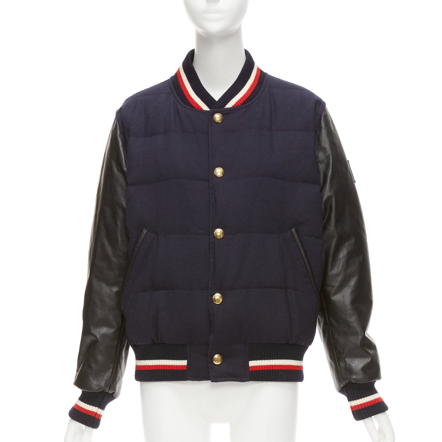 MONCLER GAMME BLEU navy wool leather sleeves goose down bomber jacket Sz2 M