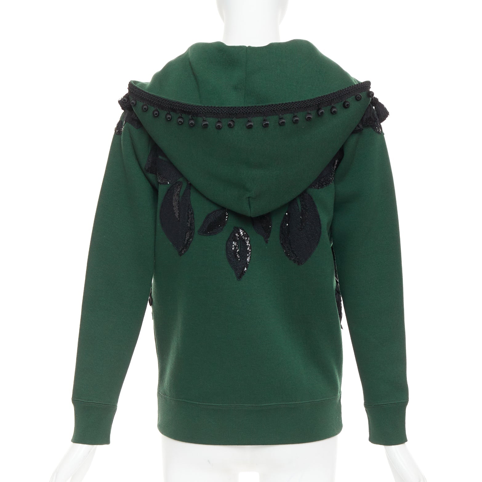Extra Details: This forest green hoodie features a complex, layered design with black lace ruffles and fringe at the shoulders and hood. It is detailed with ornate black floral embroidery on the torso and a distinctive braided trim along the central zipper. Mid-weight cotton jersey with mixed-media lace and fringe appliqués