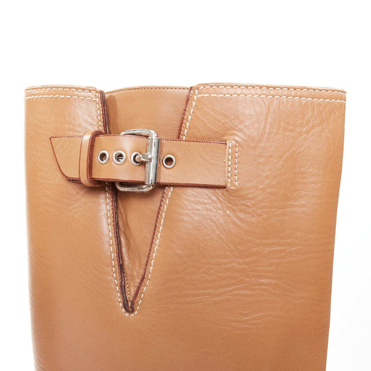 Extra Details: hey are crafted from tan or brown leather/suede with a platform sole and a high, wooden-effect heel, featuring signature buckle details at the ankle and the top of the shaft