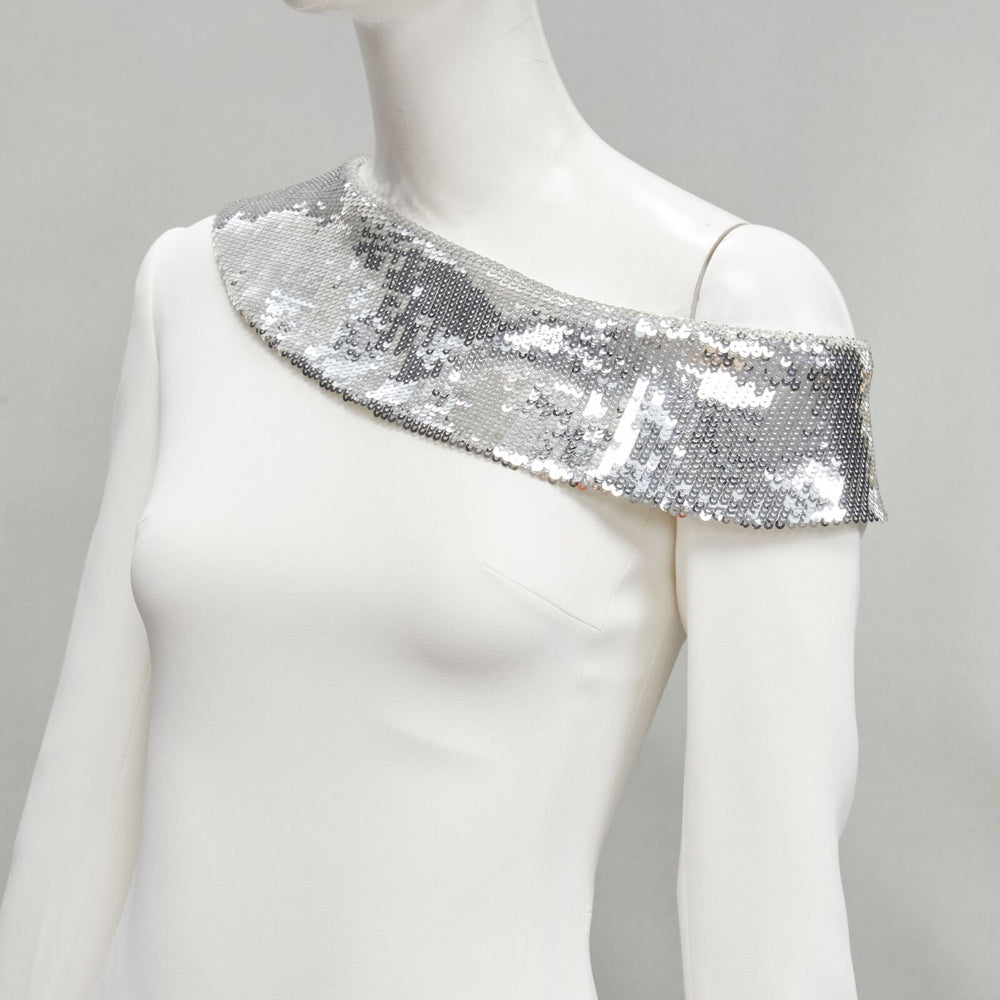 DAVID KOMA 2019 Runway silver sequins off shoulder scalloped hem dress UK6 XS