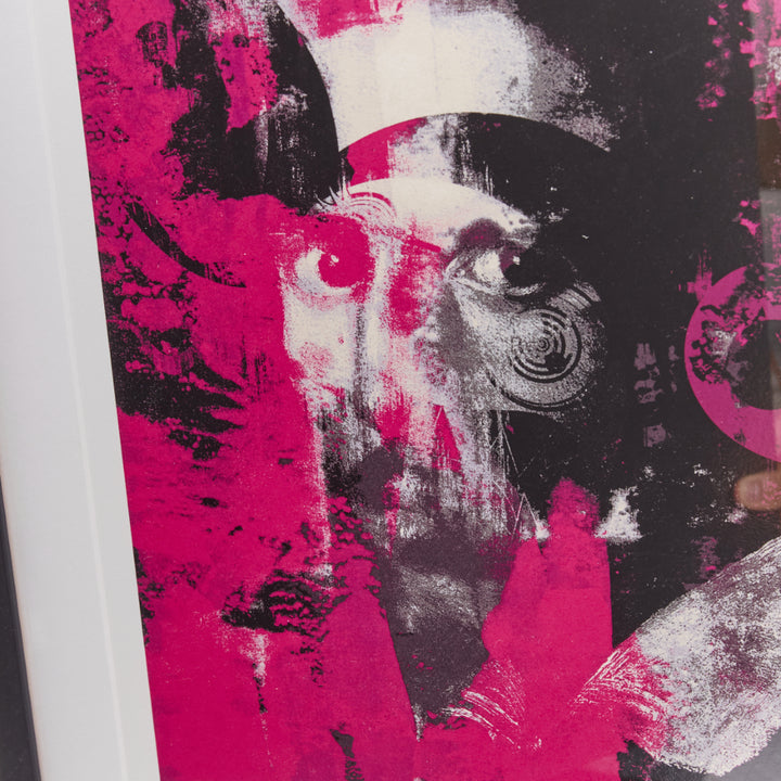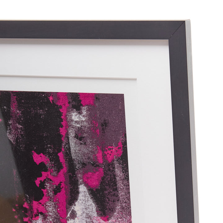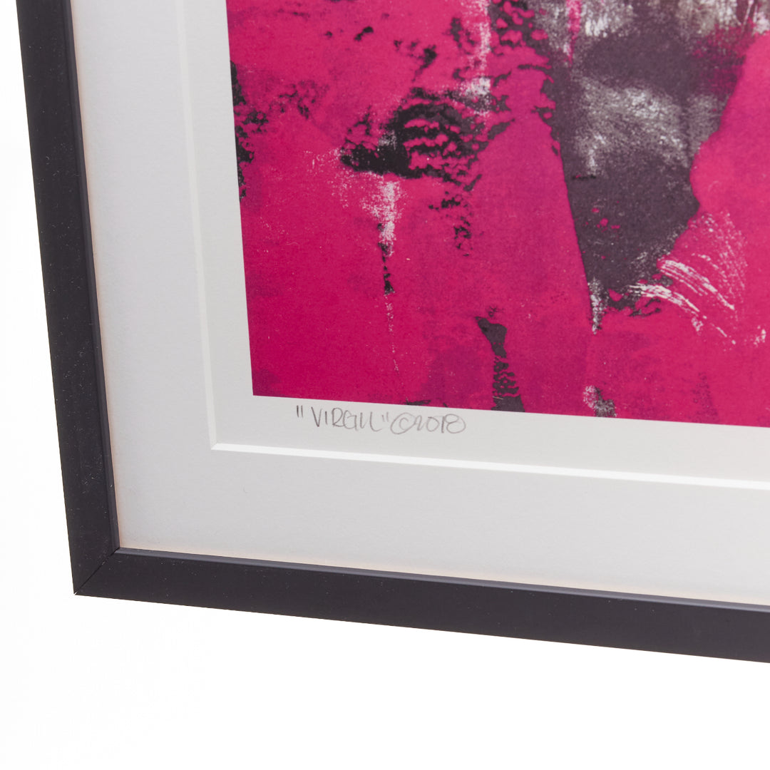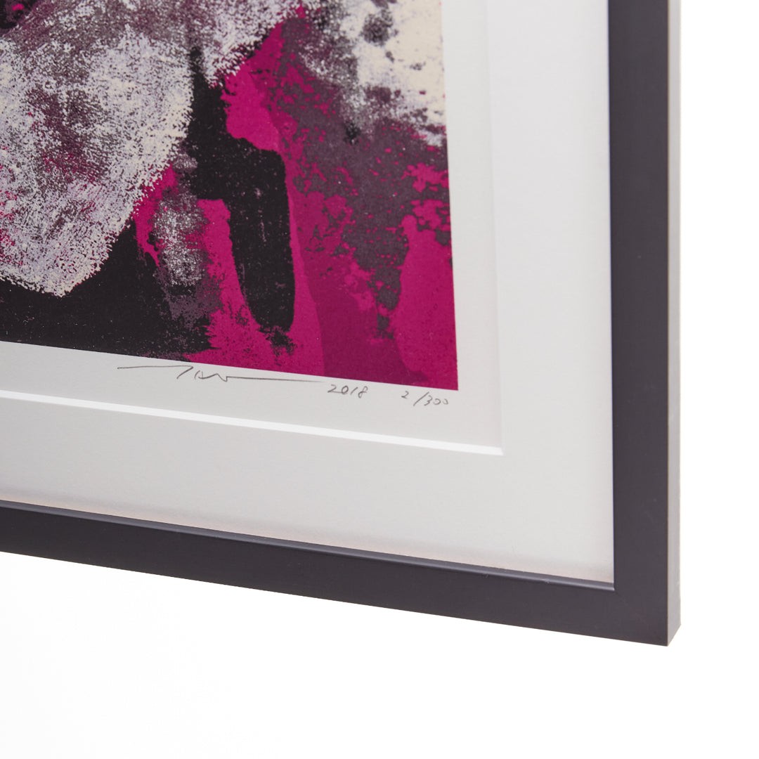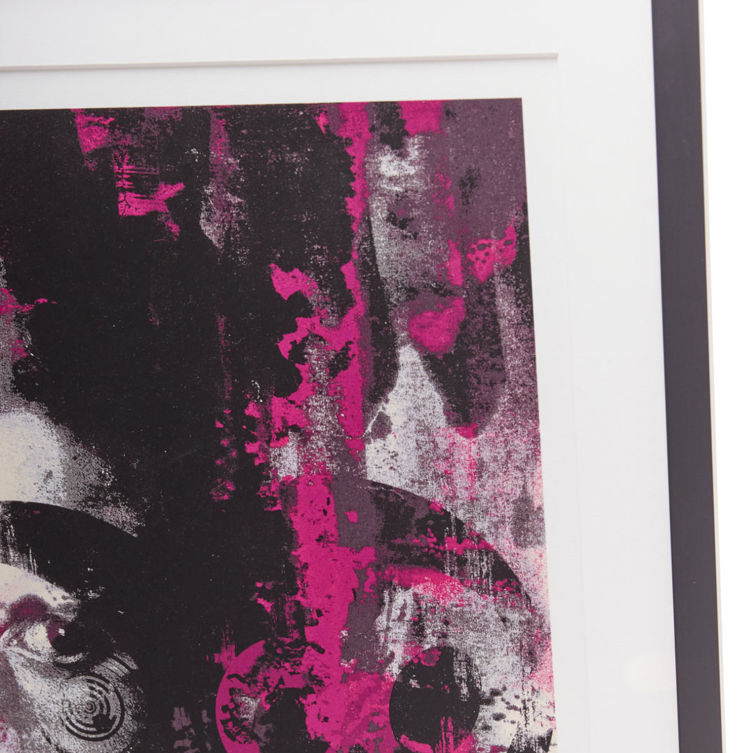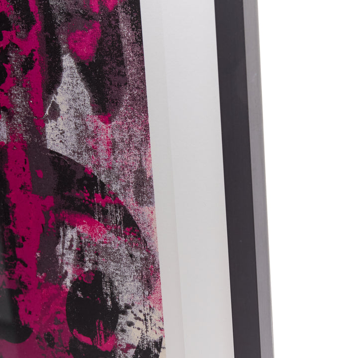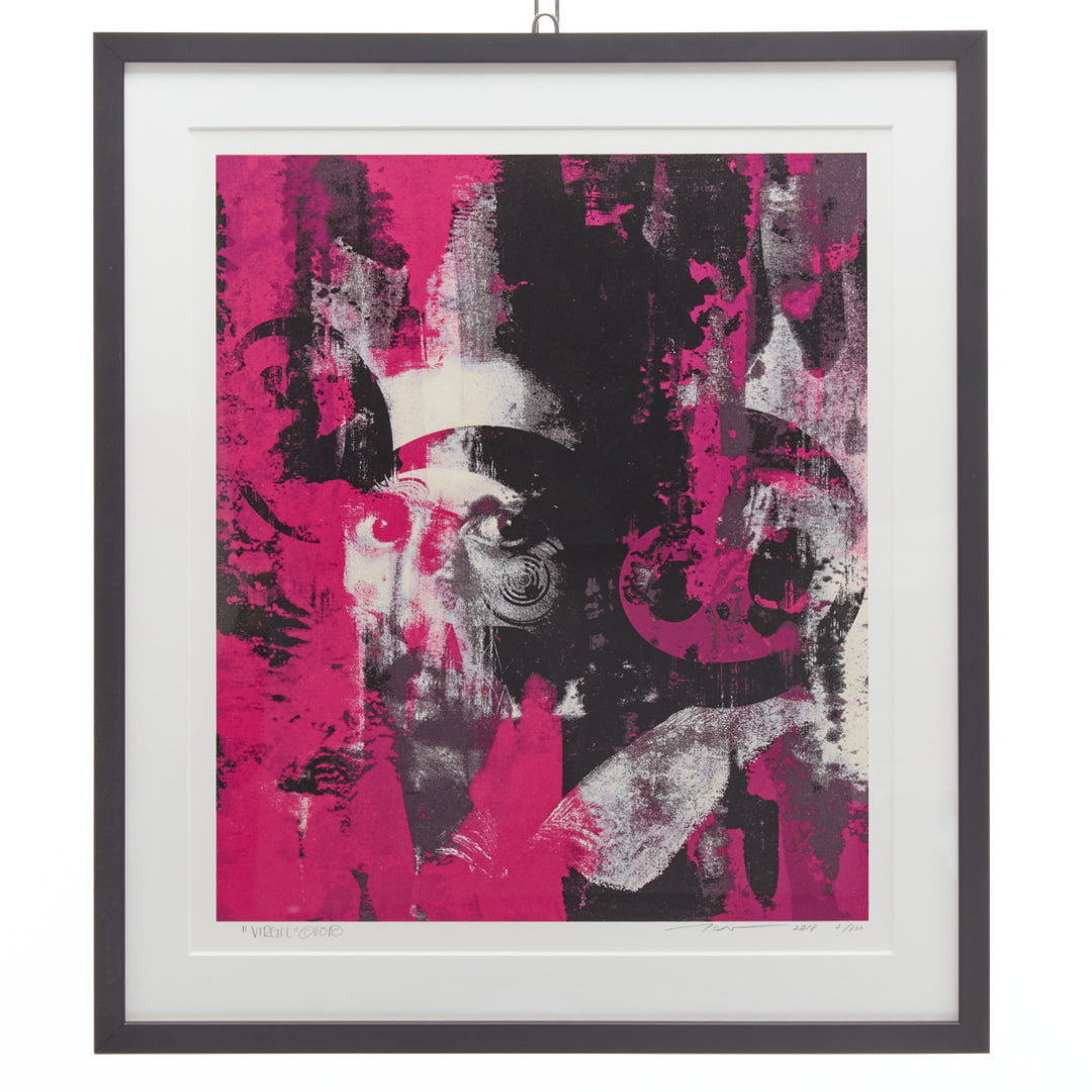 Extra Details: Takashi Murakami and Virgil Abloh. 'Glance past the future'. 2018. Silkscreen print, oil-based ink on paper. Print 46.8 x 39.8cm. With frame 49.5 x 43.5cm. Hand signed and dated by Takashi Murakami and Virgil Abloh. Ediiton 3/100. Framed - white wooden frame with standard glass. Additional information: Glance past the future is a screenprint created by Takashi Murakami and Virgil Abloh based on an acrylic-on-canvas painting of the same name from 2018. It transforms Gian Lorenzo Bernini’s 1623 self-portrait by superimposing Murakami’s character Mr. DOB on top to effect a graphic blur of pink and black, like a dilapidated street poster leaving behind traces of an art historical lineage. The duo’s ironic and insouciant artistic gestures are designed to disrupt the divisions and tiers of stratified cultural production.