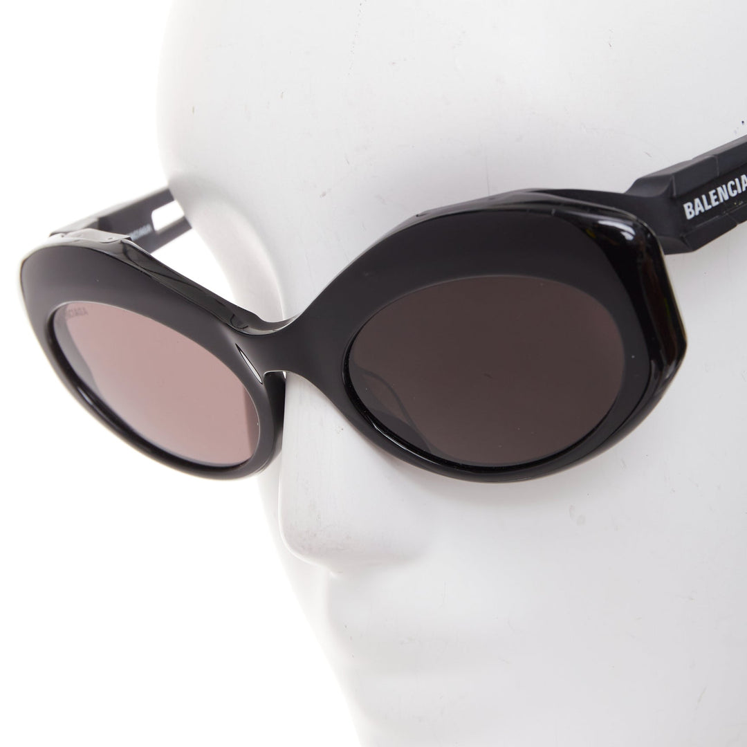 Extra Details: These black Balenciaga oval glasses are constructed from acetate. The piece features multicolor hybrid temples inspired by racing equipment one of many sports references displayed at the French labels FW'19 runway.