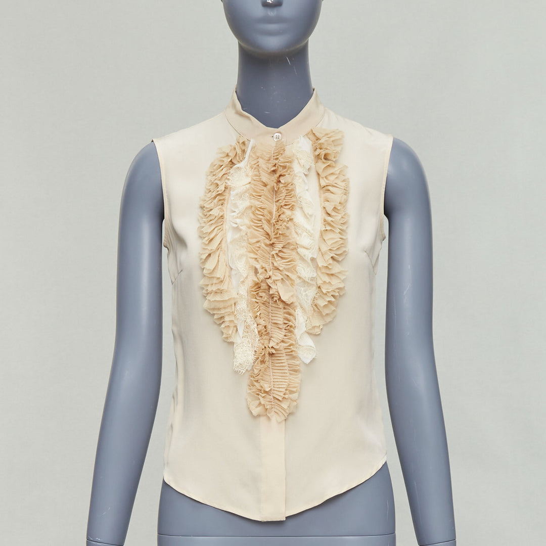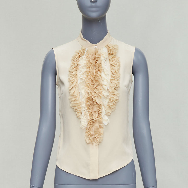 PRADA 2006 Vintage 100% silk ruffle front high collar sleeveless shirt IT38 XS