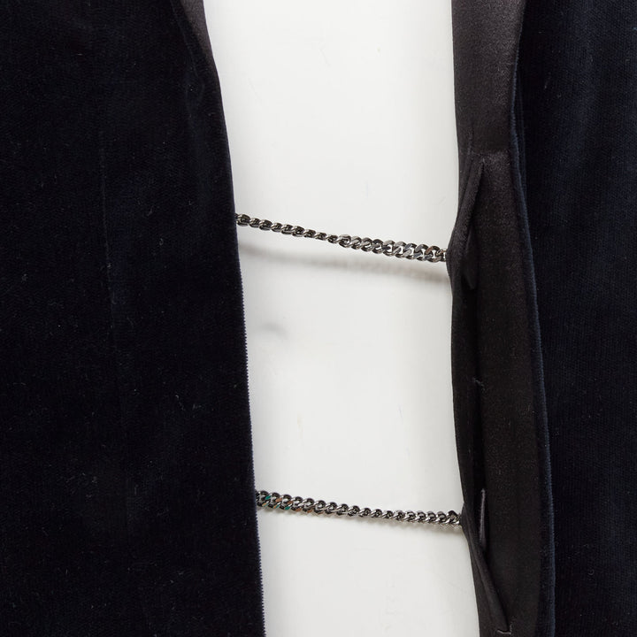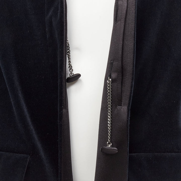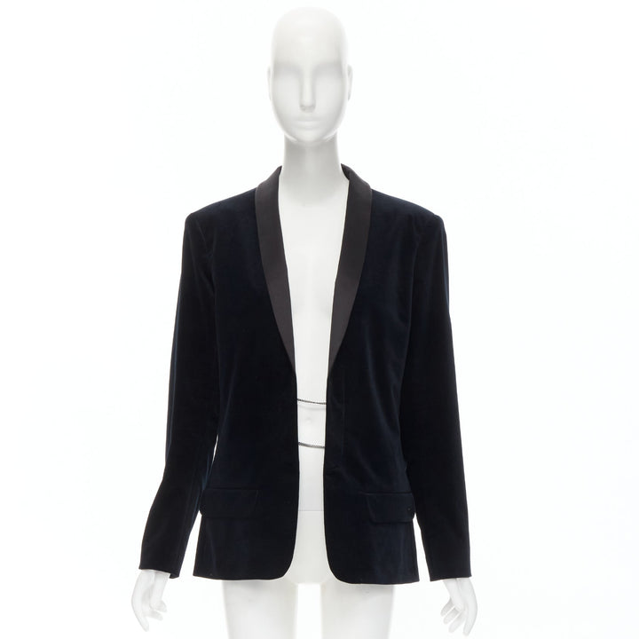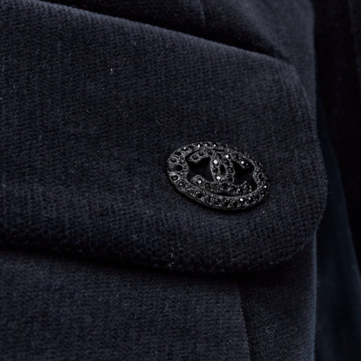Extra Details: Navy blue velvet. Black satin shawl collar. 2 flap pocket. Shoulder padded. Silver-tone concealed chained buttons. Black crystal CC logo charm on pocket. 3-button cuff. Navy silk lining. Silver chained hem.
