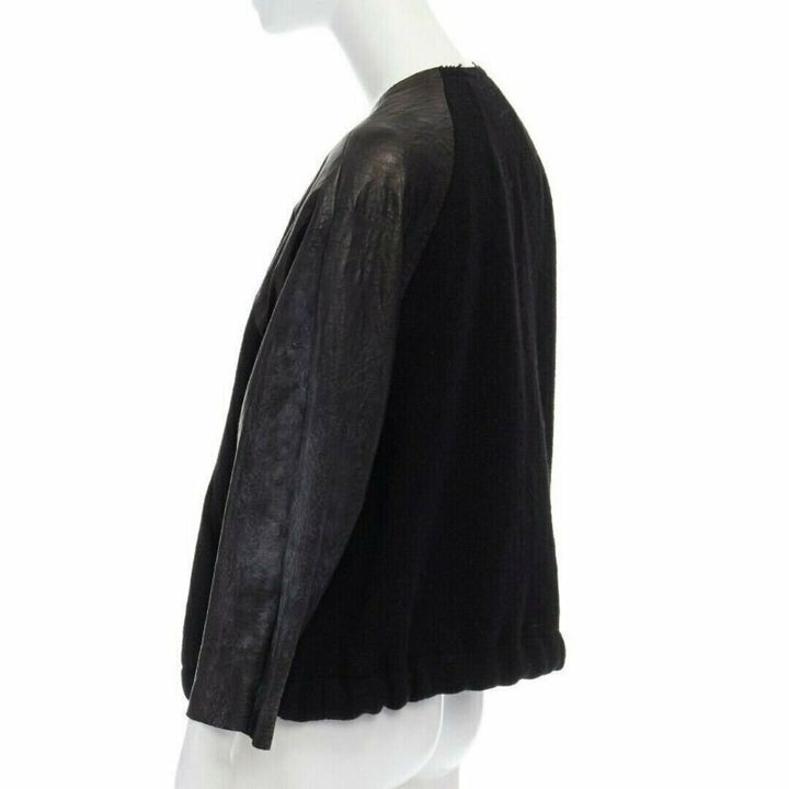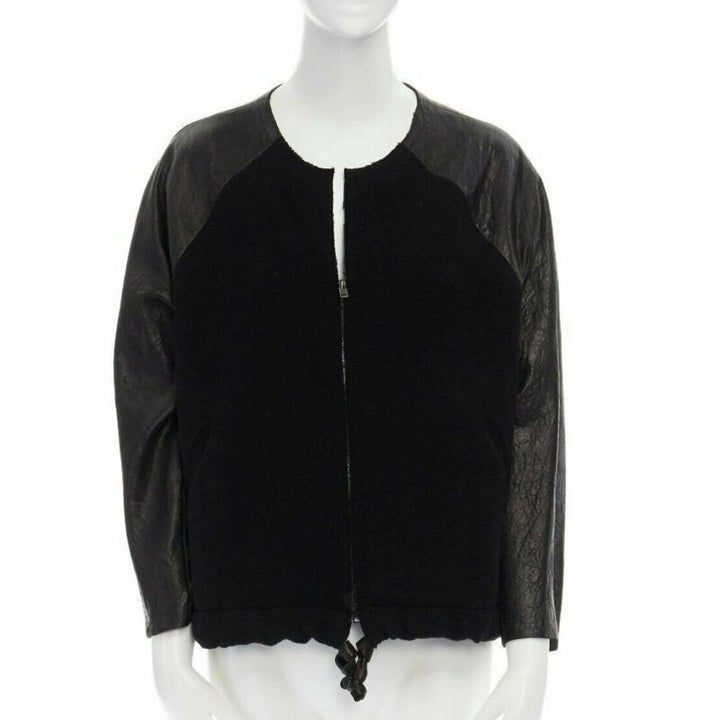 Extra Details: Leather, wool. Leather sleeves. Collarless. Wool body. Zip front closure. Dual front pocket. Leather drawstring detail at hem. Boxy fit. Baseball style jacket.